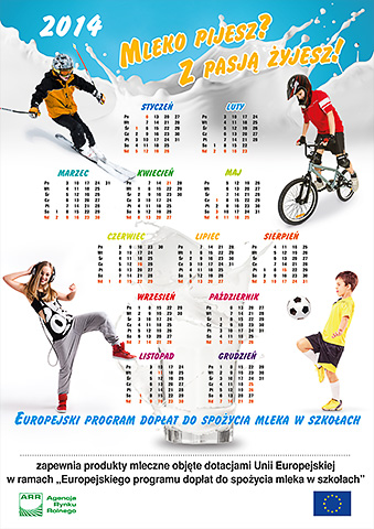 - projekt graficzny oraz copywriting plakatu-kalendarza „Szklanka mleka” (Europejskiego programu dopłat do spożycia mleka w szkołach) dla Agencji Rynku Rolnego, 2014;