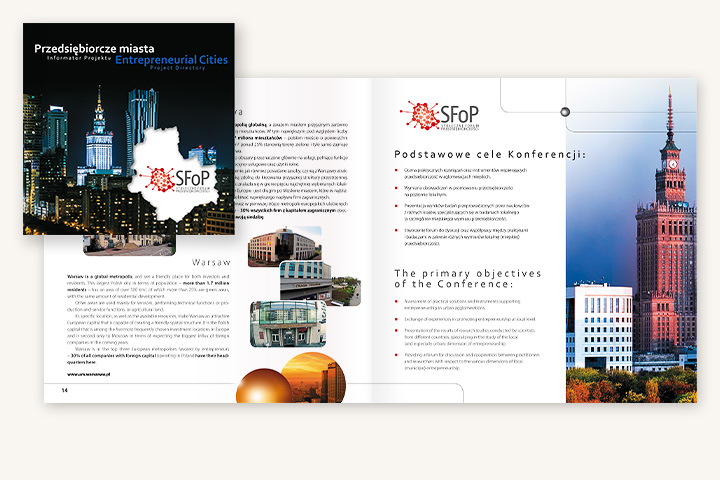 Opracowanie graficzne, projekt okładki, layoutu, skład i łamanie broszury konferencyjnej SFoP (Stołeczne Forum Przedsiębiorczości). Wydawca: Akademia Leona Koźmińskiego, 2014.