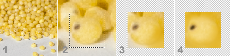 1-2. Ze zdjęcia rozsypanej kaszy jaglanej wycięłam jedno ziarenko, którego oczko wydawało mi się najbardziej wyraziste.