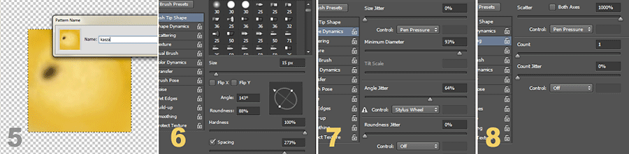 W tym momencie można już zacząć rysowanie ziarenek. Pędzel można oczywiście zdefiniować tak, by nie rysować pojedynczych ziarenek, ale żeby w trakcie malowania rozsypywało się ich od razu po kilka. Ja jednak wolałam mieć większą kontrolę nad kształtem „usypanym” z kaszy, zwłaszcza że miały z niej powstać czytelne litery, a nie bliżej nieokreślone kształty.