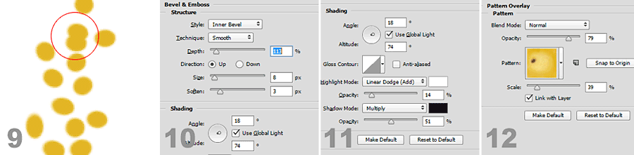 10. Pierwszej warstwie z ziarenkami nadajemy odpowiednie efekty. Bevel&Emboss: Inner Bevel, Technique Smooth, Depth 113%, Direction Up, Size 8 pikseli, Soften 3 piksele. Reszta: ustawienia domyślne.