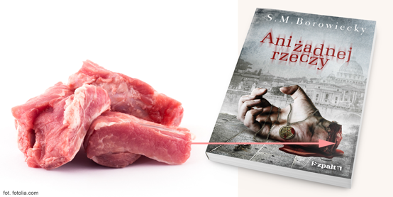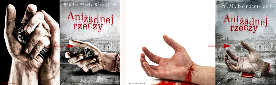 Projekt okładki powieści Sandry Borowiecky „Ani żadnej rzeczy” (Wyd. Szpalta). Odcięta ręka, w tle zarys kopuły bazyliki Św. Piotra w Rzymie. Jest klimat, jest grounge. Mocna książka, mocna okładka, ale powstała już kolejna wersja projektu, a odcięta ręka jest wciąż zbyt sztuczna. Tak sztuczna, że aż krzyczy. Nie pasuje do reszty. Co robić? Szukamy w kilku ulubionych bankach zdjęć i… nic. Rąk na stockach jest w nadmiarze, ale tej jednej – właściwej, jak na lekarstwo: a to za gruba, a to nie takie ujęcie, a to zła perspektywa, nie takie oświetlenie, nie tworzy wyraźnego kształtu koszyka... Kolejne projekty odpadają.
