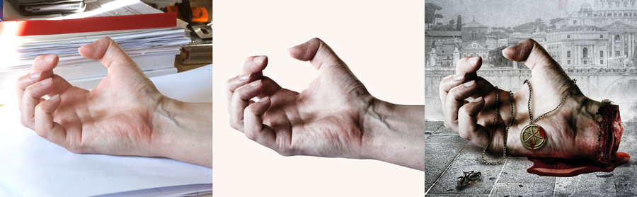 W zesztywniałą trupią dłoń – jeśli odpowiednią uda się znaleźć – trzeba będzie wmontować łańcuszek i chryzmon. Wszystkie te elementy powinny się ze sobą zgrać. Muszą wyglądać naturalnie, jak tylko naturalnie może wyglądać odcięta dłoń... Palce muszą być odpowiednio rozchylone, bo – zgodnie z treścią książki – dłoń odpowiednio spreparowano. Pani Sandra w jednym ze swoich maili pisze: „jeśli uznajemy dłoń za najważniejszy element, popracujmy nad tym, żeby nie wyglądała na wrzuconą tam jak rekwizyt”. Słusznie, tylko skąd wziąć TĘ jedyną w swoim rodzaju rękę? Nie ma innego wyjścia – w banku zdjęć jej nie znajdziemy – trzeba ją sobie „wyprodukować”.