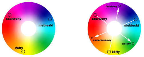 Trzy kolory podstawowe (po lewej) oraz kolory podstawowe wraz z ich komplementarnymi odpowiednikami (po prawej)